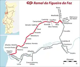 Ramal da Figueira da Foz, also known as Ramal de Pampilhosa, and originally as Linha da Beira Alta, together with the section from Pampilhosa to Vilar Formoso, is a closed railway line in Portugal. It connected the stations of Figueira da Foz (which is also the terminus of the Linha do Oeste) to the station of Pampilhosa, at the junction of Linha do Norte and Linha da Beira Alta, with a total length 50.4 km. It was opened on 3 August 1882,[1] and closed on 5 January 2009, for safety reasons.[2]