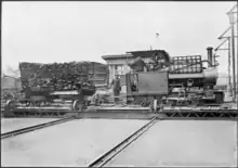 As shown in the table below, timber traffic reached a peak in 1913 and declined rapidly after 1930. There were several timber mills. R A Wilson proposed a siding in the station yard in 1907, Perham & Larson applied for a siding 20 ch (1,300 ft; 400 m) south of the station in 1908, Rangataua Timber Co (formed in 1907)[12] applied to extend theirs in 1908.[6] Perham & Larson had about 10 acres (4.0 ha) in 1909[13] In 1910 they sent timber to Lower Hutt.[14] Perham, Larsen & Co's private siding was 1+1⁄2 mi (2.4 km) from the station.[6] Perham, Larson & Co had a tramway, with a Climax loco,[15] from about 1909[16] (they had a tramway license in 1913)[17] to 1944.[18] Waiakaki Sawmilling Co had a tramway from around 1928[19] to 1933.[20] In 1940 Marton Sash & Door Co were cutting the bush.[21]