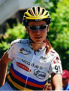 Rasa Polikevičiūtė during the introductions prior to one of the stages of the 2002 Women's Challenge stage race. She is wearing the Rainbow Jersey which signifies that she was the (then) current World Road Race Champion.