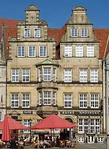 From 1594 to 1820, two beautiful three-storey gabled buildings in the Weser Renaissance style stood of the site of today's Raths-Apotheke. Differing in height and width, they had been designed by Lüder von Bentheim, one with two bays, the other with three. They housed the apothecary and the excise office. The apothecary itself had a tall triangular gable with pyramids on either side.[1] In the 17th century, additional pharmacies were established in Bremen: the "Einhorn-Apotheke" in 1640, and the "Hirsch-Apotheke" and the "Apotheke zur weißen Rose" in 1667.