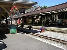 This station has two platforms, one serving trains travelling towards Barrow-in-Furness and one for trains travelling towards Carlisle. All former station buildings on the National Rail site, which is now unstaffed, are currently owned by the Eskdale Railway company - the main building being a pub, The Ratty Arms,[2] the old southbound shelter a museum (leaving only small shelters for mainline travellers) and the goods shed an engineering workshop. The old Furness Railway main line signal box south of the station also survives - though out of railway use since 1965, it has been restored by the R&ER as a working museum exhibit and is open to the public.[3]
