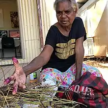 At Durrmu Arts, most of the prints are done from dilly bags and basket weavings. They teach the children the language, the culture, and how to do weaving. It's important for Wilson to teach them so weaving remains strong. In 2011, the Peppimenarti Association formed the Durrmu Arts Aboriginal Corporation to represent an internationally renowned group of weavers and painters who work with durrmu designs.[6] It stands strong today as a peaceful town. There is little tolerance for alcohol consumption, formal education is highly valued. Wilson and the other women at Durrmu Arts reinvigorated the tradition of large, circular mats by combining brilliant colours. She later began to paint to transfer weaving designs to a larger, two-dimensional medium. Durrmu Arts is managed by a small group of women. On a typical day, artists gather in the communal outdoor studio in the morning, preferring to paint and weave before the humidity and heat arrive.[5]