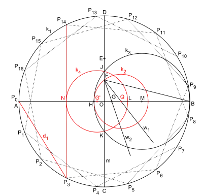- ↑ Duane W. DeTemple "Carlyle Circles and the Lemoine Simplicity of Polygon Constructions" in The American Mathematical Monthly, Volume 98, Issuc 1 (Feb. 1991), 97–108. "4. Construction of the Regular Heptadecagon (17-gon)" pp. 101–104, p.103, web.archive document, selected on 28 January 2017
