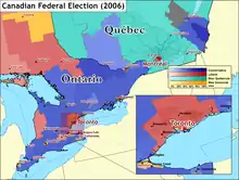 Map of the 2006 Canadian federal election results, showing Alberta as the main stronghold for the Conservative party, with significant support also coming from the interior regions of British Columbia, southern Saskatchewan, and Manitoba, as well as southern Ontario. Liberal support was greatest in urban areas, particularly in the Toronto area.
