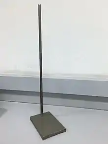 Retort stands commonly have a cast iron base of around 200 x 125 mm. The rod may be up to 750 mm and screws into a female thread in the base.[5] The height of the rod is sufficient for most experiments and usually fits within fume hoods and glove boxes. If a taller rod is required, the solid base is usually replaced by a tripod for stability when supporting larger apparatuses, such as extremely large tubes, bulk chemical bottles etc. The height can be adjusted by moving the attached point of the given clamp to the stand. The base lowers the centre of gravity of the stand, thus increasing stability.