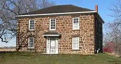 The Hitchcock House is located west of the city limits of Lewis, on a hill overlooking the western bank of the East Nishnabotna River. It is a two-story structure, built out of locally sourced random ashlar sandstone, and resting on a rubblestone foundation. Its walls are 21 inches (53 cm) thick, and its interior framing is heavy hand-hewn timbers. Stylistically it is a vernacular interpretation of Federal period architecture. Unusual features of its interior include an apparently purpose-built basement chamber, whose access was probably concealed by a false cabinet. The other basement room is fitted with a cooking fireplace, and was accessible via an exterior entrance and by stairs from above. It is surmised that these rooms were used for the shelter and support of fugitive slaves.[3]