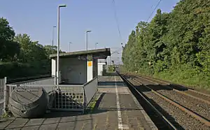 Rheinhausen Ost (east) is a station designated as a Haltepunkt (halt) in the Duisburg suburb of Rheinhausen in the German state of North Rhine-Westphalia. It was built in 1907 after the commissioning of the Rheinhausen–Kleve railway on the left (western) bank of the Lower Rhine for workers of the Krupp’s steel works. The station was directly at the main entrance to the steel works, Tor 1 (gate 1), which is now heritage-listed.