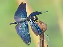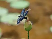 Rhyothemis fuliginosa is a short and stout dragonfly with a body length of 32-41 millimeters in length. The wings are 30–40 mm across and patterned with a deep blue iridescent shade.[11][3] Depending on the viewing angle, the dragonfly's wings can vary in color due to their light scattering properties, with some appearing golden in the light.[4][9] The wing patterns are thought to be a determinant between members of the same species to avoid mating with the incorrect partner.[3]