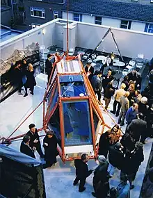 Ski Haus was conceived while skiing late and high in the Alps: evening sun, a beautiful, clear, starlit night, twinkling lights of the village in the valley, a reluctance to return: Would it be possible to stay here in the beautiful, cold silence? The SkiHaus serves as a mobile alpine hut or a ‘hard tent’. The lightweight, all-aluminium structure weighs only 315 kg and is designed to be lifted into position by helicopter. It is well-insulated using lightweight aviation materials and has a self-sufficient energy system powered by solar and wind generators. Since 1992 the SkiHaus has been tested by the team together with mountain guides and helicopter engineers at varying altitudes in the Swiss Alps up to 3901m (next to the ‘Kleines Matterhorn’). It will be used further by the local mountain guide centres for ski touring, climbing, guide training, ski races and medical positions. Besides its rescue and safety functions, the SkiHaus is an architectural vehicle with which to explore the third dimension and the wide clear spaces on top of the mountains. It has been situated on the Swiss-Italian ridge close to the ‘Kleines Matterhorn" since May 2004 and is currently used as shelter and accommodation for skiers and climbers.[3]