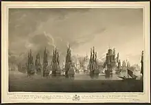 Richard Poulden, a native of Portsea, was born in 1766, and early in life adopted the naval profession.[1][2] He entered the Royal Navy on 22 July 1776, as Captain's Servant, on board the Hector, 74 guns, Captain Sir John Hamilton, on the Home station, where he continued employed as Midshipman in the Cambridge, 74 guns, Captain Francis John Hartwell, and Diligente sloop, Captain Anthony Hunt, until transferred, in October 1780, to the Barfleur, 90 guns, fitting for the flag of Sir Samuel Hood, under whom, on arriving in the West Indies, he fought in a partial action with the Comte de Grasse on 29 April 1781.[3] On 8 January 1782 he was nominated, by Hood, Acting-Lieutenant of the Alfred, 74 guns, Captains William Bain, Robert Barber, and Thomas Dumaresq; to which ship the Admiralty confirmed him on 12 February 1783.[3] He returned to England in July 1784, and was subsequently appointed, on the Home and Mediterranean stations; in March 1788, to the Thorn sloop, Captains William Taylor and John Woodley; on 27 September 1791 and 11 February 1793, to the Spitfire and Nemesis, both commanded by Captain John Woodley; in September 1793, to the Alcide, 74 guns, successive flag-ship of Admirals Robert Linzee and Philip Cosby, and under Cosby he co-operated in the reduction of Corsica; and on 21 January 1795, to the Irresistible, 74 guns, Captains John Leigh Douglas and Richard Grindall, part of Lord Bridport's fleet in the action off the Ile de Groix.[3] On that occasion, Captain Grindall having been wounded, the charge of the ship devolved upon Poulden; whose promotion to the rank of Commander was in consequence effected by a commission dated 29 June 1795.[3]