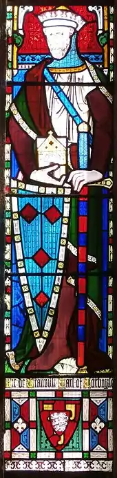 Below the left-hand figure is inscribed: "Rob. FitzHamon Earl of Corboyle", with attributed arms under showing: Azure, a lion rampant guardant or impaling Azure, a lion rampant or a bordure of the last. The right hand figure is of Richard de Granville, the younger brother of Robert FitzHamon and one of the Twelve Knights of Glamorgan who followed his brother in effecting the conquest of Glamorgan. He holds in his hands the church of his foundation of Neath Abbey, Glamorgan. Below is inscribed: "Ric. de Granville Earl of Corboyle" with attributed arms under showing: Gules, three clarions or (the arms of the Grenvilles' later overlord and Robert FitzHamon's heir in the feudal barony of Gloucester,[15] Richard de Clare, Earl of Gloucester, which arms were later adopted by the Grenvilles[14]) with an inescutcheon of pretence of Gules, three lions passant argent. The Granvilles claimed in the 17th century to have been the heirs male of Robert FitzHamon (who left only a daughter as his sole heiress) in his supposed Earldom of Corboil.[14]