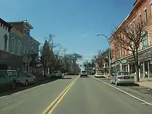 In Wolcott, the path of Ridge Road is known by several names as it traverses the industrial western half of the community—based around a spur of the Ontario Midland Railroad—and its residential eastern portion. It remains West Main Street until New Hartford Street, at which point it becomes just Main Street. One block later, Main Street splits into East Main Street and Mill Street, with Ridge Road following the latter northeast across Wolcott Creek. On the opposite bank of the creek, Mill Street meets Auburn Street, formerly the northernmost part of NY 89,[15] and changes names one last time to Oswego Street. The street leaves Wolcott village on an easterly routing, becoming CR 163 and Ridge Road at the eastern village line.[14]