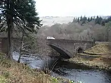 The level of Loch Garry has been raised by the construction of a dam at its eastern end, where the river formerly passed through a gorge.[7] The dam includes a Borland-type fish pass, which works in a similar way to a canal lock, enabling salmon to access Loch Garry.[8] Immediately downstream of the dam is a category C listed suspension footbridge, designed by the engineers Speirs and Company of Glasgow, and dating from the late 19th century.[9] White Bridge is a little further downstream, and as the river enters the village of Invergarry, the only substantial settlement along its course, it is joined by Aldernaig Burn, flowing southwards from Loch Lundie, and is crossed by a category B listed bowstring suspension footbridge with a wooden deck. It was erected in 1892, and carries a plaque that states: "Erected by Mrs Ellice of Glengarry and Glenquoich 1892".[10] The bridge is an early steel design which spans 197 feet (60 m), but by 2009 some of the main trusses were sufficiently corroded that it was closed for safety reasons. Repairs were made by the Forestry Commission, and the bridge reopened in 2011.[11] A more substantial bridge carries the A82 Inverness to Fort William road over the river. Its single arch was constructed of concrete in 1932, and it was probably designed by Mears and Carus-Wilson.[12] Prior to its construction and the re-alignment of the A82, the road crossed the river further downstream on a single span bridge dating from the early 19th century. This then only carried local traffic for the Glengarry Castle Hotel and nearby housing,[13] but the upstream face collapsed in 2020, and it has been closed to all traffic. Some 3.5 miles (5.6 km) from Loch Garry, the river enters Loch Oich, the surface level of which is 105 feet (32 m) AOD.[14]