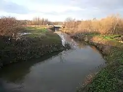 Between Chesterfield and Tapton, the river flows over a large weir while the canal is protected from flooding by a flood gate.[4] The two waterways remain close as they flow northwards between New Whittington and Brimington, where the River Drone joins from the west. At Old Whittington both turn to the east, before turning north again at Staveley. Just before Renishaw, the river passes Slittingmill Farm, once the site of a slitting mill constructed by George Sitwell in the 1650s, used to split iron bars from his furnaces into thin strips for the production of nails, and the first to be constructed in the East Midlands.[7] After the River Doe Lea joins the Rother from the east, the river is crossed by a grade II listed two-arched bridge built around 1840 by the North Midland Railway, which carries a minor road to the golf course.[8]