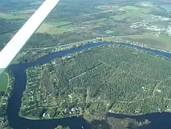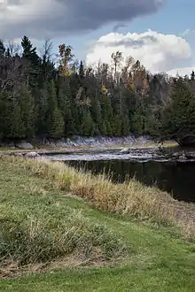 The "Rivière au Saumon" is divided into two arms, the southern branch (Ditton River), near Chartierville and the eastern branch. It is subject to floods and sudden drops, submerging a large expanse of lowland that borders its banks. It was navigated by fishing boats and offered the settlers who lived on its shores a good means of transport (Rouillard, 1914).[2] It is joined by the Ditton River near the village of La Patrie, and continues towards Scotstown, Lingwick, where it is crossed by the McVetty-McKenzie Bridge near Fontainebleau, then flows into the Saint-François River at Weedon. Its flow being more pronounced than that of the Saint-François River, many spring floods occur in this sector.
