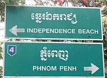 Road signs in Cambodia (Khmer: ឧបសម្ព័ន្ធស្តីពីសញ្ញាចរាចរផ្លូវគោក) are standardized road signs are similar to those used in Europe but much of it resembles road signage systems used in South American countries with certain differences. The designs of road signage match their neighbours of Thailand and Malaysia, both of which adopt a modified version of the South American road signage system (despite both Thailand and Malaysia being part of Asia). Until the early 1980s, Cambodia closely followed American, European, Australian, and Japanese practices in road sign design, with diamond-shaped warning signs and circular restrictive signs to regulate traffic. Unlike Thailand and Malaysia, Cambodia does not use the FHWA Series fonts ("Highway Gothic") typeface, favouring Helvetica instead.