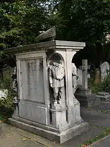 On 13 December 1866 the monument (which can be seen in the gallery beneath the Brompton Cemetery monograph, to this well-known oarsman, who was Champion of the Thames from 1846 to 1852, was formally uncovered in Brompton Cemetery. It is made of Portland stone, and is 9 ft. high, 6 ft. 6in. long, and 3 ft. 6in. wide. On the top slab is the representation of a wherry bottom upwards, over which is thrown a coat and badge, and by the side are broken sculls. This slab is supported by four figures cut out of the solid stonework, one at each corner. The figures represent four champions of the Thames : first, Robert Coombes, in his rowing costume, holding a broken scull; second, Tom Cole, of Chelsea, wearing Doggett's Coat and Badge, with the peculiar pineapple button ; third, James Messenger, of Kingston, with the coat and badge of the Thames National Regatta; fourth, Harry Kelley, of Putney, an athlete in rowing costume. Each figure stands on an octagon dwarf pedestal.