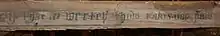 Drummond's own house at Carnock in Stirlingshire was demolished in 1941. It was abandoned and unsafe due to subsidence caused by essential coalworking during the 1914-18 war. It had an interesting plan with two staircases. The armorial panel of 1548 with his coat of arms and that of Marjorie Elphinstone can be seen at Sissinghurst Castle Garden. Painted ceiling boards and the front door of the house are displayed at Stirling Smith Museum and Art Gallery.[22] The oak beams from the ceiling, retained by Historic Environment Scotland have been dated to 1589 and carry inscriptions exhorting moral precepts, some from the Bible, some from the Stoic philosopher Gaius Musonius Rufus, perhaps following the English author William Baldwin although using Scottish spellings. Two now incomplete lines are: "Gif that in werteu thow takis ony paine ..." and "Naikit I cam into the warld ..."[23] The use of the first of these mottoes reflects the schoolroom of James VI at Stirling Castle, where he penned a Latin version into a catalogue of his library compiled by his tutor Peter Young. Mary I of England wrote an English version in her Book of Hours.[24] Historic Environment Scotland also has some plasterwork from a later ceiling from the house including the Nova Scotia arms of Nicolson of Carnock.