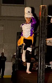 Peck returned to Chikara on July 28, now working under a mask as "The Mysterious and Handsome Stranger", a Texan gimmick based on Dusty Rhodes,[69] defeating Icarus in a singles match.[64][70][71] He then started a win streak, defeating The Shard,[70] Grizzly Redwood,[72] Tim Donst,[72][73] and Lancelot Bravado in singles matches.[74][75] On September 14, The Stranger entered the 2012 King of Trios tournament, teaming with Osaka Pro Wrestling representative Mihara and Tito Santana. The trio was, however, defeated in their first round match by The Spectral Envoy (Frightmare, Hallowicked and UltraMantis Black), who went on to win the entire tournament.[76][77] Prior to the match, The Stranger came face-to-face with Veronica, who had just managed the Throwbacks in their first round match and who, in storyline, was impressed with the southern gentleman yet unable to recognize the man under the mask.[77] Following the tournament, Peck continued his singles match win streak over deviAnt and Walter Eaton.[78][79][80] Following his win over Eaton, The Stranger made a veiled challenge towards Mark Angelosetti.[69] The Stranger's win streak ended on November 10, when he was pinned by Angelosetti in a four tag team elimination match, during which Touchdown also killed his pet bird Sapphire.[81][82] The following day, The Stranger was defeated by Angelosetti in a singles match via disqualification.[83] On December 2 at Chikara's third internet pay-per-view, Under the Hood, The Mysterious and Handsome Stranger was crowned Chikara's homecoming king. After a dance with the homecoming queen, Veronica, he dumped pig slop over her, before unmasking, revealing his true identity.[84]