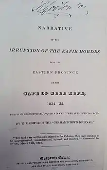 • A Narrative of the Irruption of the Kafir Hordes Into the Eastern Province of the Cape of Good Hope, 1834-35: Compiled from Official Documents and Other Authentic Sources. Meurant and Godlonton. 1836.