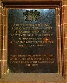 Platt was well known for philanthropic activities in Stalybridge and Manchester, being a patron of the arts, a supporter of the Stalybridge Mechanics Institute and local churches. In December 1857 Platt and his wife were honoured by their workforce with a tea party and presentation at Foresters' Hall. His other charitable work included bequests to Chester Cathedral and donations to Owens College. A portrait of Robert Platt is today in the possession of the University of Manchester