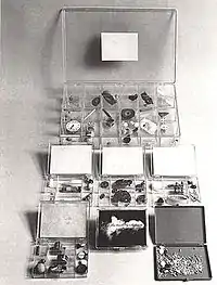 A number of versions of the Flux Timekit, 1967, by Robert Watts, collecting together objects that exist in different time scales.