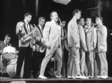 Johnny O'Keefe performing at the Sydney Stadium while being filmed for the documentary Rock 'n' Roll
