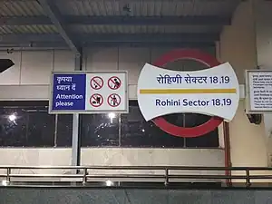 The Rohini Sector 18, 19 is a station on the Yellow Line of the Delhi Metro. It is an elevated station and is located in Rohini in the National Capital Region of India. The station was inaugurated on 10 November 2015.[1]