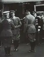 Hitler's arrival in Rome meet at the station by King Victor Emmanuel III and Mussolini.