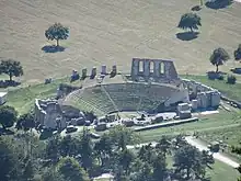 The ruins consist of limestone arcades, which originally formed a two-story hemicircle with 27 arches. The lower arcade had a vomitorium with roofed corridor. The theater originally had an orchestra pit separated from the proscenium by a tall podium. The theater was expected to sit nearly 6000 persons. The present layout derives from restoration efforts in the past two centuries. A nearby museum (antiquarium) displays archeologic finds from Gubbio. In the summer, the theater is used for some outdoor performances.[1]