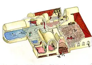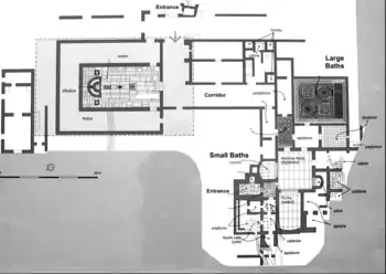 The original nucleus perhaps dating to the 1st-2nd century AD was the subject of successive renovations, expansions and modifications during the 3rd, 4th and 5th centuries AD.[13] It consists of two contiguous areas, with independent entrances and different construction and dimensional features. The Small Baths (rooms 27, 28, 32, 40, 41, 43, 44) to the north-west of the Large Baths appear to be later and intended as an alternative or replacement, perhaps due to technical problems or to their considerable size and reduced use.