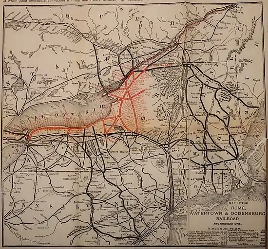 The RW&O had terminals in Suspension Bridge, Rochester, Syracuse, Rome, Utica, Natural Bridge, Massena, Ogdensburg, Clayton, Cape Vincent and Sackets Harbor.