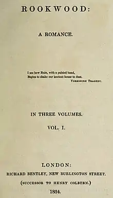 Rookwood is a novel by William Harrison Ainsworth published in 1834. It is a historical and gothic romance that describes a dispute over the legitimate claim for the inheritance of Rookwood Place and the Rookwood family name.