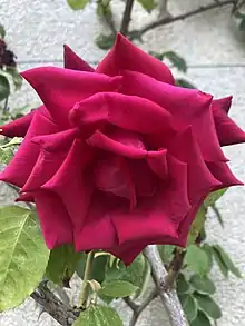 'Ena Harkness' was introduced into Britain by Harkness Roses in 1946 and "made the fortune of the Harkness family".[3] The legendary rose nursery, which continues to sell roses today, was established in 1879 in Bedale, Yorkshire by brothers John Harkness (1857-1933) and (Robert Harkness (1851-1920).[5] 'Ena Harkness' was used to develop two rose cultivars, Rosa 'Hanne' and Rosa 'Red Dandy'.[6] 'Ena Harkness' was awarded the RNRS Gold Medal by the Royal National Rose Society (RNRS) in 1945 and the Portland Gold Medal in 1955.[2]