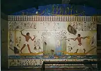 The Rosicrucian Egyptian Museum contains a composite replica of an ancient Egyptian rock-cut tomb, based on photos and sketches taken by Rosicrucian expeditions to tombs at Beni Hasan, in order to give the guests the experience of being in such an excavation. Below are photographs of the interior of the replica tomb, largely containing scenes from the Book of the Dead. The dark interior of the tomb replica is evident.