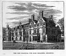 Hospitals dedicated to the treatment of children have existed in England since the mid-19th century: the first opened in Liverpool in 1851.[2] By this time, Brighton was a rapidly growing town with a history of proactively establishing social, educational and medical institutions.[3] In response to a meeting at Brighton Town Hall on 23 June 1868, local doctor R.P.B. Taaffe founded the town's first children's hospital, the Brighton Hospital for Sick Children, at 178 Western Road on 3 August of that year.[4] Two years later, it moved to the former Church Hill School, a disused building on Dyke Road; Bishop of Chichester Richard Durnford conducted the reopening ceremony on 14 July 1871.[4] Although this had 20 beds in the main ward, an eight-bed ward for bone disorders and an isolation ward for infectious diseases, within ten years it was felt necessary to move to another larger building.[4]