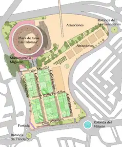 In 1967, the Royal Fair moved again, once more due to the demands on land in Algeciras, to a then-undeveloped area on the outskirts of the city next to the Carretera de Málaga, in the area called Las Colinas.[7] The old fairground was completely built over, as was a large part of the park, which had the Avenida de Francisco Franco (now the Avenida de las Fuerzas Armadas) built across its western side.[8] The new Las Palomas bullring was built adjacent to the fairground in 1967; it would eventually replace La Perseverancia, which was demolished in 1976. The fair's new location was heavily criticised at the time, as it was thought by many to be too far from the city, but the continued expansion of Algeciras has meant that it is now surrounded by built-up areas within the city limits.[9]