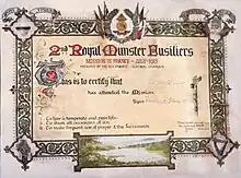 In May, the 2nd Royal Munster Fusiliers received many of the personnel from the disbanded 9th Royal Munster Fusiliers, bringing it up to strength for the summer campaign. The battalions' first noteworthy operation was the carefully planned Liévin raid on 25 June. It was during this action that Lieutenant Arthur Batten-Pooll would win the regiment's second Victoria Cross, although losses were heavy for the battalion with 5 officers and 60 other ranks killed or wounded.[47] The 2nd Royal Munster Fusiliers were transferred with its division down to the Somme sector in July for the opening of the Battle of the Somme, entering the lines on 14 July and capturing its objectives two days later. The battalion repulsed the German counterattack on 18 July, with an officer and 26 men killed, 127 wounded and 50 gassed. The Munsters were in reserve until 20 August, when they entered the lines once again for steady fighting but ran into heavy off-target and ineffective British artillery bombardment, killing 4 officers and 29 other ranks. A continual toll of casualties made September a costly month for the battalion. After a month's break in October, the 2 Royal Munster Fusiliers returned to the Somme for maintenance duties, then went into the mud filled front-line trenches from 27 November onwards, with a steady stream of casualties from frostbite and raids continuing to the end of December. Throughout the Somme campaign the 2RMF retained its local and Irish character.[48]