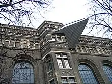 The eastern wing facing Queen's Park was designed by Alfred H. Chapman and James Oxley. Opened in 1933, it included the museum's elaborate art deco, Byzantine-inspired rotunda and a new main entrance. The linking wing and rear (west) façade of the Queen's Park wing were originally done in the same yellow brick as the 1914 building, with minor Italianate detailing. However, the Queen's Park façade of the expansion broke away from the heavy Italianate style of the original structure. It was built in a neo-Byzantine style with rusticated stone, triple windows contained within recessed arches and different-coloured stones arranged in a variety of patterns.[31] This development from the Roman-inspired Italianate to a Byzantine-influenced style reflected the historical development of Byzantine architecture from Roman architecture. Common among neo-Byzantine buildings in North America, the façade also contains elements of Gothic Revival in its relief carvings, gargoyles and statues. The ornate ceiling of the rotunda is covered predominantly in gold back painted glass mosaic tiles, with coloured mosaic geometric patterns and images of real and mythical animals.