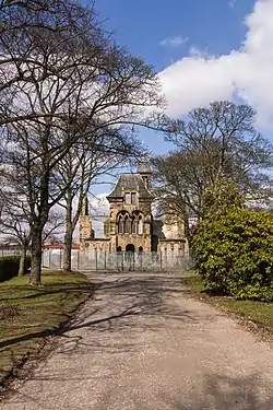 The building initially used for the institution was in Gayfield Square, Edinburgh in 1855 and administered by 'The Society for the Education of the Imbecile Youth of Scotland'.[2] Dr. and Mrs. Brodie educated the children during the time in Edinburgh,[3] however; the building was too small for all the pupils and staff which meant the committee had to look for another site for the institution.[4] It was necessary to find bigger premises for the institution, five acres near Larbert railway station were obtained to build a property and this was founded as the 'Home for Imbecile and Invalid Children' in 1863.[2] The architect for the original building was Frederick Thomas Pilkington,[5] his own house Egremont was started after the building at Larbert was completed, both were the High Victorian Gothic revival style that Pilkington favoured.[6] Pilkington travelled to England to look at the designs of leading institutions there, he drew up plans and estimated the cost of erecting the building to be £1800.[4] The funds for the building were partly raised by a Ladies' Auxiliary Committee in Edinburgh, who managed to raise £1350 through mainly small donations.[4]