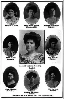The Royal Welsh Ladies' Choir performed for the King Edward VII at Windsor Castle, and for the King and Queen on the Royal Yacht, at Queen Alexandra Dock in Cardiff in July 1907.[6] The next year (1908) they embarked on a series of extensive tours of North America,[7] including San Francisco,[8] Winnipeg,[9] Atlanta,[10] and several appearances in the coal towns of the Wyoming Valley.[11][12]
