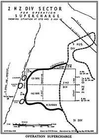 On the night of 1/2 November 1942, the Eighth Army attacked again in the north, with 2nd New Zealand Division in the lead. Freyberg placed 151 Brigade on the right and 152 Brigade on the left. The aim was to attack directly westwards across the Rahman track, with the infantry leading the night assault and 9th Armoured Brigade (now commanded by Brigadier John C. Currie) again passing through to break the enemy gun line and allow X Corps to break out. The assault went to plan except that opposition on the left was heavier than expected which slowed the advance. As a result, the advancing tanks were highlighted against the dawn sky in the east and began to be picked off by Axis anti-tank fire. The Regiment was in the centre of the 9th Armoured Brigade, and the CO lost touch with both his artillery support and close anti-tank support. In the growing light, the B squadron commander (Major M.StJ.V.Gibbs) realised that he was in a ring of enemy anti-tank guns, ahead and to both flanks. He gave the order to 'Charge' and B Squadron overran the anti-tank positions, losing some vehicles but destroying the enemy gun line.[30] Meanwhile, the 21st Panzer Division was counter-attacking A and C Squadrons and at 4 pm the regiment (now down to four tanks) was withdrawn. The 1st Armoured Division from X Corps were just behind the 9th Armoured Brigade but there were no liaison officers between the units and 1st Armoured did not take the opportunity to push on through the broken Axis gun-line.[31]