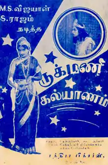Rukmani Kalyanam (transl.Rukmani's marriage) is a 1936 Indian Tamil-language Hindu mythological film produced and directed by Bhalji Pendharkar. It stars S. Rajam as the Hindu god Krishna and M. S. Vijayal as his wife Rukmani.[2]