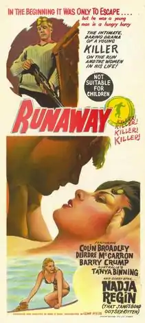Runaway, also called Runaway Killer, is a 1964 New Zealand made thriller film and a road movie. John O’Shea of Pacific Films produced, directed and co-wrote it. Shot in black and white and released on 35 mm and also 16 mm, it was cut to 80 minutes and renamed Runaway Killer for release in Britain, although this lost continuity between scenes. The film stars Colin Broadley in the lead, and several New Zealanders who became famous in other fields; Kiri Te Kanawa, Barry Crump and Ray Columbus.