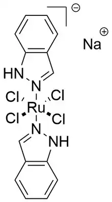 KP1019, a salt of trans-tetrachlorobis(indazole)ruthenate(III) were investigated as drugs.[16] KP1019 has an octahedral structure with two trans N-donor indazole and four chloride ligands in the equatorial plane.[17][18][19] It has a low solubility in water, which makes it difficult to transport in the bloodstream. Instead KP1339 is used as a preparation of KP1019 in clinical trials, since it has a better solubility as a sodium salt.[19]