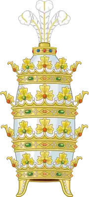 The helmet-crown consisted of four crowns set inside an Austrian-style helmet, and was topped by "a plumed aigrette with a crescent-shaped mount".[3] The crown was made of gold, and studded with "enormous twelve-carat pearls, a head band with pointed diamonds, forty-seven rubies, twenty-seven emeralds, forty-nine pearls, and a large turquoise".[4] The total value of the piece was estimated at 115,000 Venetian ducats.[5]