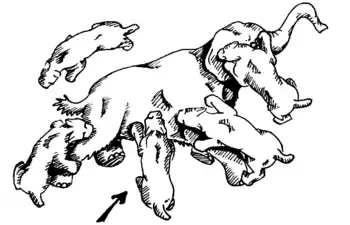 In 1985, American paleontologist William Akersten suggested the shearing bite.[54][55] This method of killing is similar to the style of killing seen in hyenas and canines today. A group of machairodonts captured and completely subdued a prey item, holding it still while one from the group bit into the abdominal cavity, pulled back and tore open the body.
