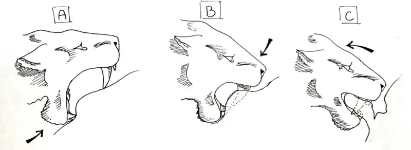 For this technique to work, a specific sequence of motions would have to be followed. First, the animal must be completely subdued, and the predatory machairodonts must be social, so that several individuals can hold the prey animal down. The individual preparing to deliver the killing bite would open its mouth at maximum gape, and with its mandible, press up on the skin of the belly. Creating a depression where the lower canines and incisors press into the skin, a slight fold is created in the skin above the lower teeth as the mandible is shoved upward. Next, the upper canines are pressed into the skin and the muscles of the neck are used to depress the head, so instead of pulling the jaw 'up', the skull is pressed 'down' . When the canines pierce the skin, they are lowered until the gape of the mouth is roughly 45°, where the mandible is pulled up in addition to the skull still being depressed. The small flanges on the anterior portion of the mandible of most machairodonts would be used to aid the depression of the skull. When the animal's mouth is closed, it holds a thick flap of skin between its jaws, behind its canines, and the animal uses the muscles of its lower back and forequarters to pull back, tearing the flap clear of the body. This large gash, once opened, leaves intestines uncovered and arteries and veins torn. The bleeding animal would die within minutes, and the shock of repeated bites, tearing innards from the body, could speed up the process.[56]