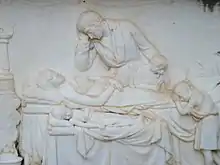 A carving of the family of Marija and Petar Škuljević exhibiting sadness over their deaths