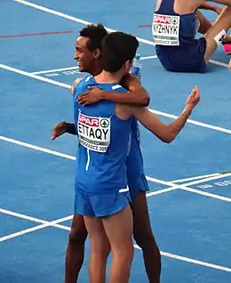 ![]() Ettaqui, from behind, celebrates the victory of temmate Crippa in the 5000 m at the 2017 European U-23 Championships. | ||||||||||||||